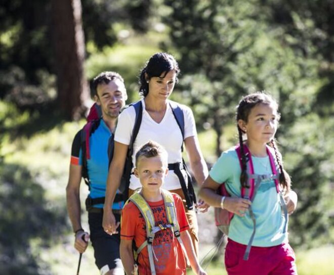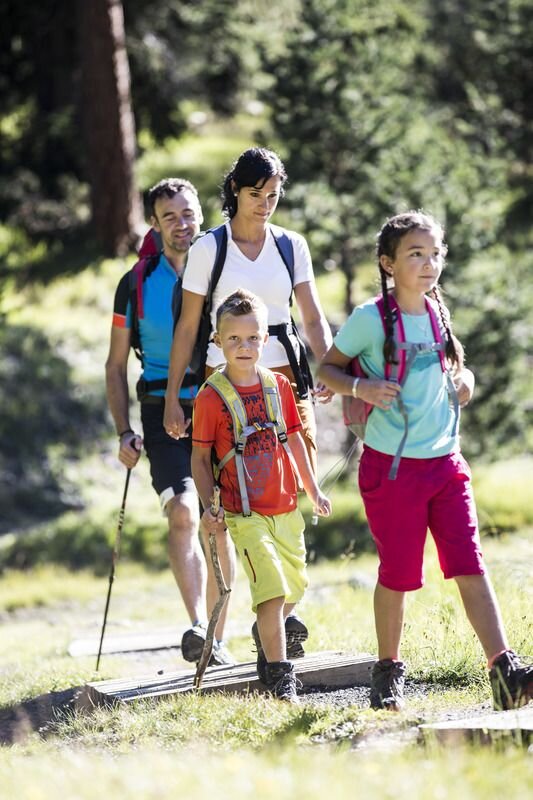 Die Wanderung startet bei der Kirche und führt über einen breiten Forstweg entlag der Wiesen rund um Nauders.