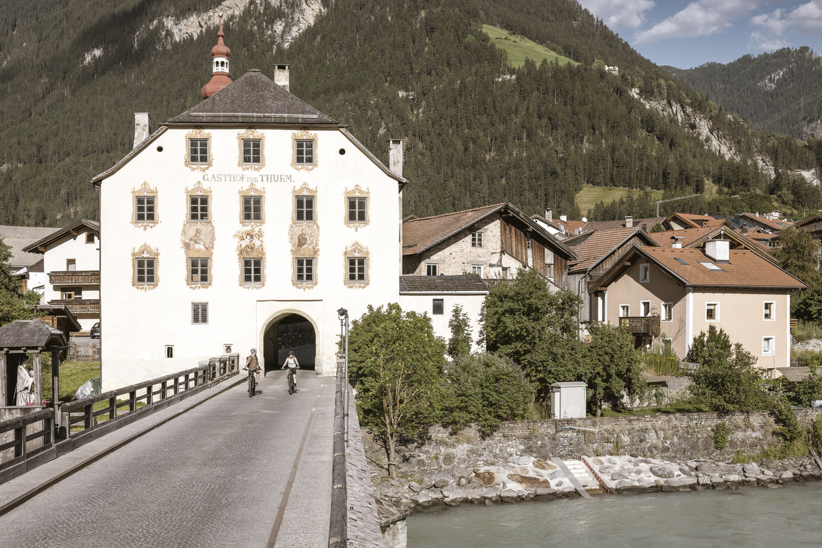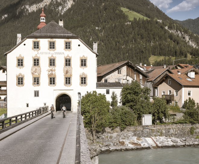 Erfahre bei einem gemütlichen Spaziergang mehr über die historischen Sehenswürdigkeiten und die besonderen Gebäude von Pfunds, die mit faszinierenden Geschichten verbunden sind.