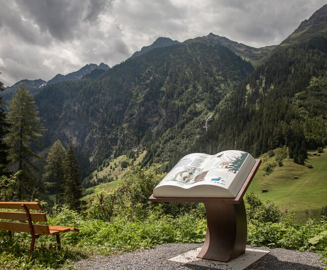 Das Buch "Der Wald im Kaunertal" finden Sie entlang dem Wander- & Spazierweg Richtung Aussichtsplattform bei der Abzweigung nach Keilschrofen & Mautstelle.