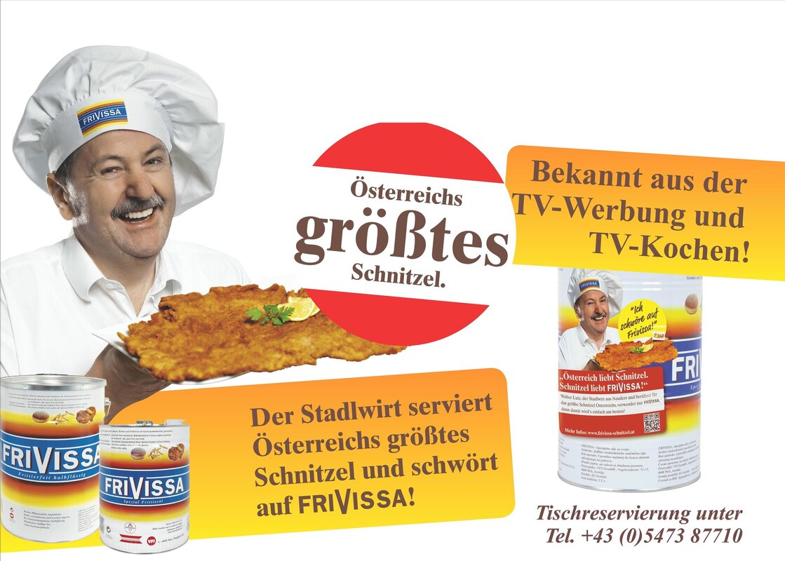 Genießen Sie echte Tiroler Gastlichkeit beim Stadlwirt. Lassen Sie sich von der grandiosen Natur beeindrucken, die uns hier in Nauders umgibt. Eine Große Auswahl an Speisen erwartet Sie beim Stadlwirt! Genießen Sie das größte Schnitzel Österreich´s im Stadlwirt oder bei Ihnen zu Hause! Zum Mitnehmen erhalten Sie einen speziellen Karton. Ihr Riesenschnitzel können Sie täglich ab 16 Uhr telefonisch (05473/87710) bestellen und dann beim Stadlwirt abholen. Sie können natürlich auch einfach vorbeikommen und ein paar Minuten warten, bis der Stadlwirt Ihr Schnitzel zubereitet hat!