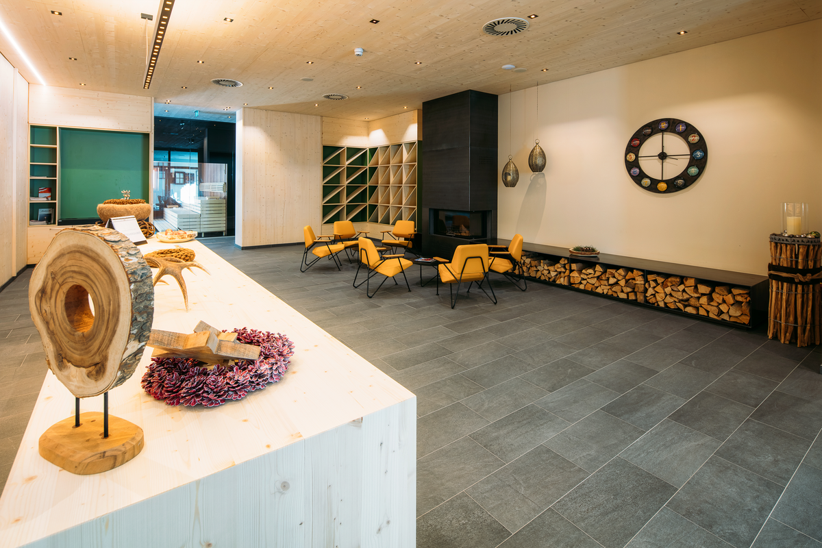 Im Hallenbad und in der Saunalandschaft am Dach des Gebäudes mit Blick auf die umliegende Bergwelt ist es ein Leichtes, in ein naturverbundenes Wohlfühl-Erlebnis einzutauchen. Holz, Granit, Heu und das mit dem Qualitätssiegel ausgezeichnete Quellwasser zeichnen den Stil und das Ambiente der Freizeitanlage aus.