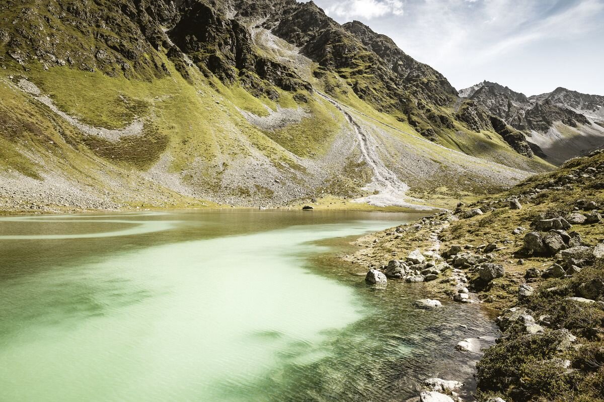 Vom Hohenzollernhaus in Pfunds führt eine kurze Wanderung hoch zum Smaragdsee, dieser See ist durch einen Schlammlawinenabgang im Jahr 2019 entstanden.