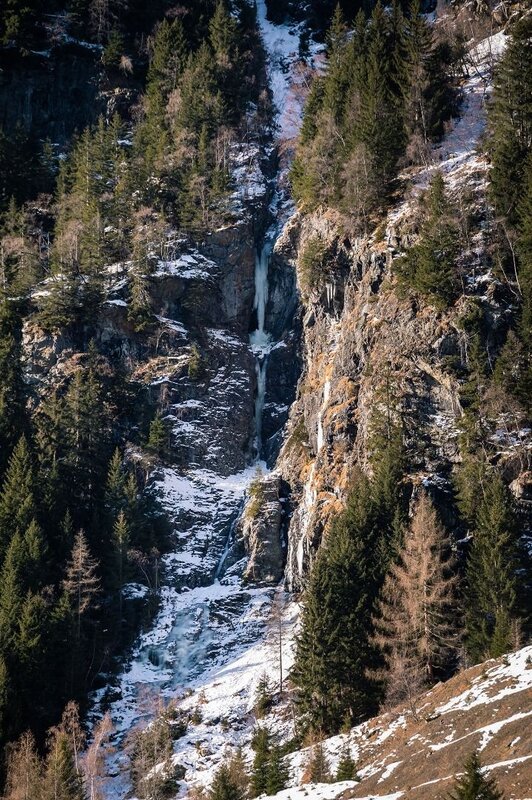 Zustieg: ca. 150 m hinter der Mautstelle rechts über eine Holzbrücke (Indianerspielplatz) und der Langlauflopie Tal auswärts bis unter einen großen Schneehang, über diesen direkt zum Einstieg.
