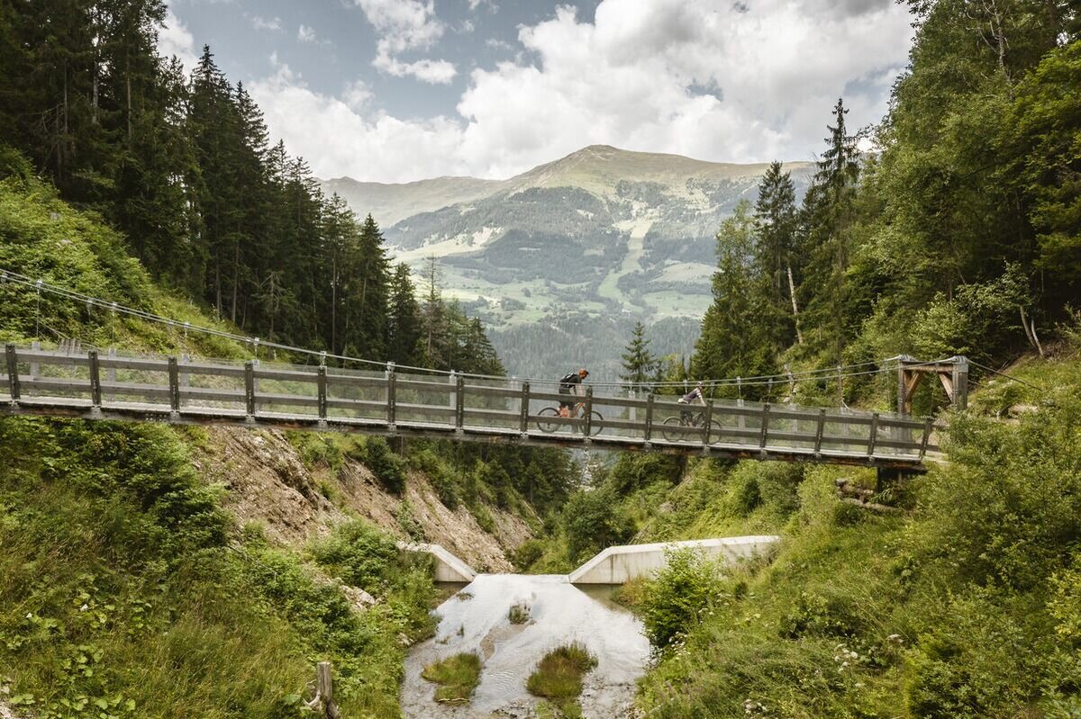 Gestartet wird direkt bei der Bergstation der Seilbahn Ried-Fendels. Durch geschickte Trassenführung kommt der absolut naturbelassene Trail ohne künstliche Elemente aus. Zum Bremsen regt nicht nur das kupierte Wald- und Wiesengelände mit kurzen Steilstücken an, sondern immer wieder auch der schöne Ausblick hinunter nach Ried. Bei der ca. 30 Meter langen, Hängebrücke über den Wildbach – daher der Name – bleibt dann jeder gerne stehen, um einen Blick in die Schlucht zu werfen. Hier rauscht das Adrenalin gefahrenfrei mit dem Wildwasser um die Wette.