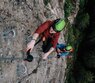 Roter Abschnitt: Über eine ausgesetzte Querung mit bester Aussicht wird ein leicht überhängender Aufschwung, die Schlüsselstelle erreicht. Weiter querend gelangt man zum finalen Wandteil, welcher wiederum leicht überhängend aber stets mit Trittstufen zum Ausstieg führt.