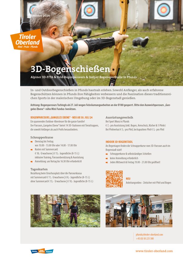 In Pfunds liegt ein einzigartiger 3D-Bogenparcours, der Anfänger und Profi-Bogenschützen gleichermaßen begeistert. Die einzelnen Schuss-Stationen passen sich den natürlichen Gegebenheiten zwischen hohen Felsabstürzen und dem Inn an. Jede der 3D-Stationen ist eine Herausforderung für die Bogenschützen. Da kommt die urige Labestation mitten im Gelände gerade recht für eine gemütliche Rast.