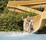 Großzügige Wasserfläche im Rundbeckendesign, 42 m lange Wasserrutsche, Gegenstrom, Kinderbecken, Liegewiese, Spielplatz