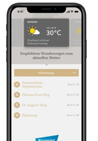 Heute heiß, morgen gewittrig, übermorgen Nebel: nachmal ist es gar nicht so leicht, die passende Wadnerung zum prognostizierten Wetter zu finden. Eine eigens entwickelte Webanwendung bietet unkomplizierte Planungshilfe per Samrtphone. Nach den Parametern "Wetter" und "Tourencharakter" filtert sie passende Wanderempfehlungen heraus - für sichere, entspannte Zeit in den Kaunertaler Bergen.