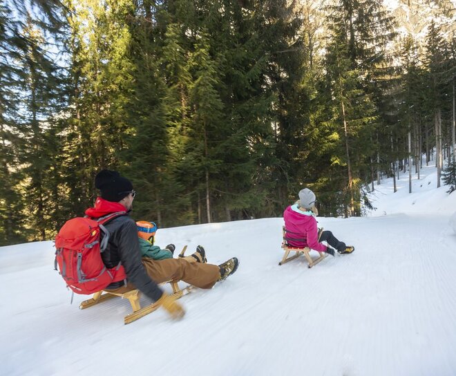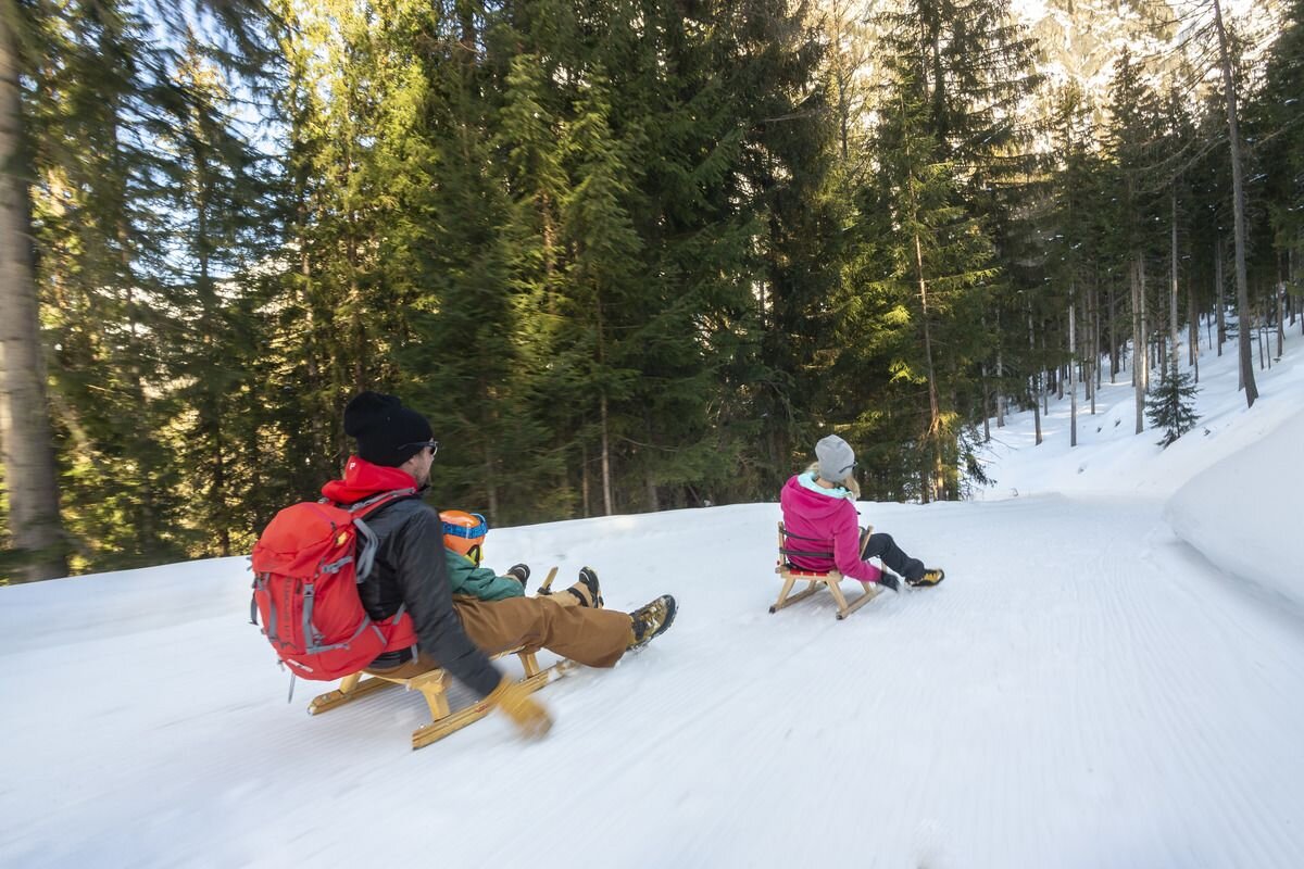 Vorbei beim Ferienhotel Lärchenhof startet der Winterwanderweg bzw. die Naturrodelbahn Verpeil. Nach einem wunderschönen Aufstieg erreichen Sie den Start der Rodelbahn.