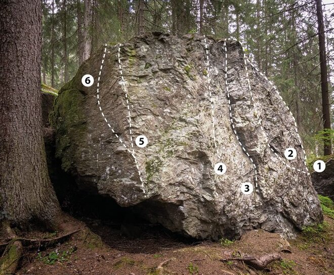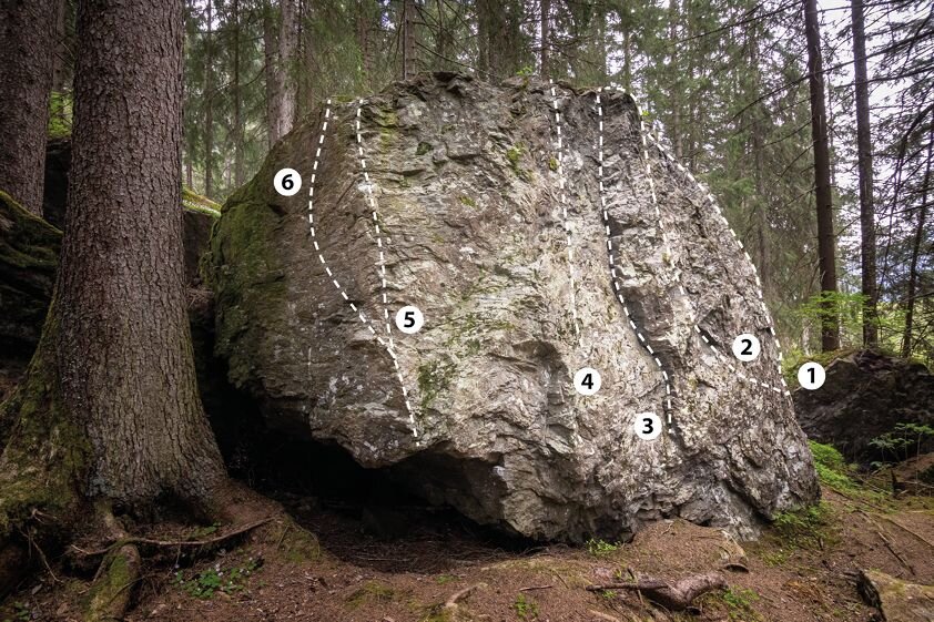 Bei diesem Block bewältigt man 6 Boulderprobleme mit einer Schwierigkeit von 5a - 6b.