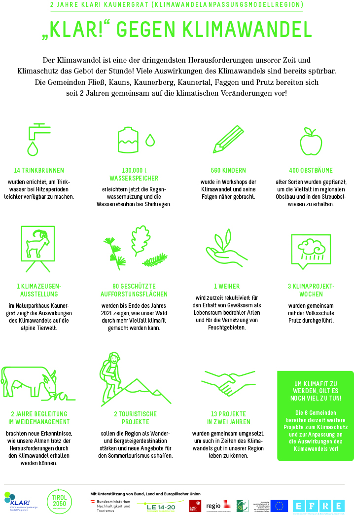 Auch die Region Kaunergrat ist mit dabei. KLAR! ist die Abkürzung für Klimawandel-Anpassungs-Modell-Region. Der Klimawandel trifft auch die Alpenregionen. Anpassung an die Auswirkungen durch den Klimawandel ist notwendig, um auch langfristig die hohe Lebensqualität sichern zu können.