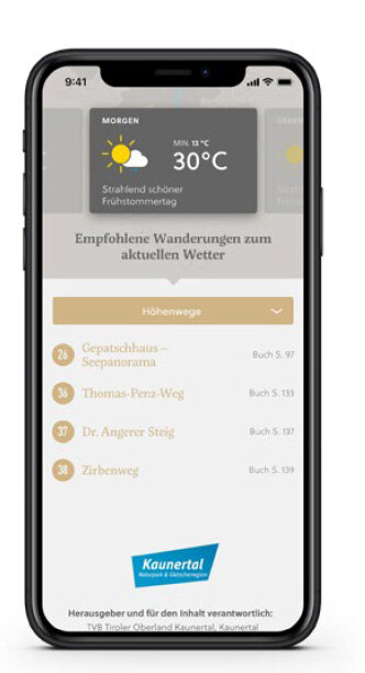 Heute heiß, morgen gewittrig, übermogen Regen: Manchmal ist es gar nicht so leicht, die passende Wanderung zum prognostizierten Wetter zu finden. Eine eigens entwickelte Webanwendung bietet unkomplizierte Planungshilfe per Smartphone. Nach den Parametern "Wetter" und "Tourencharakter" filtert sie passende Wanderempfehlungen heraus - für sichere, entspannte Zeit in Kaunertals Bergen.
