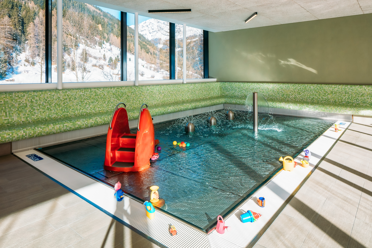 Sie tauchen in das 30° Grad warme, qualitätsgeprüfte Quellwasser unseres Tiroler Schwimmbads ein. Spüren Sie, wie Sie entspannen? Während Sie vom Wasser aus das Bergpanorama des Kaunertals betrachten, machen Sie ein paar Schwimmzüge. Wie fühlt sich das an?