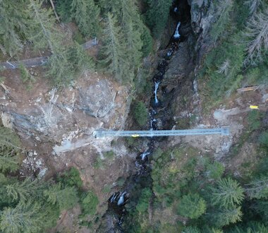 Im Herbst 2020 errichtete die Abteilung Spezialtiefbau der HTB Baugesellschaft die neue Hängebrücke über die Verpeilschlucht. In einer Höhe von ca. 35 Metern wurde die knapp 33 Meter lange Stahlkonstruktion per Helikopter angeliefert und verankert. Aufgrund der Geländesituation und beengter Platzverhältnisse war die Montage – insbesondere der Treppenfundamente – äußerst anspruchsvoll. Insgesamt vier Monate benötigte das Generalunternehmen HTB für Anfertigung, Felssicherungsmaßnahmen und Befestigung. „Neben den außergewöhnlichen Geländeverhältnissen war die Gewährleistung der Arbeitssicherheit die größte Herausforderung“, schildert der zuständige HTB-Bauleiter Ing. Philipp Auer. Gleichzeitig errichteten TVB- und Gemeindearbeiter den neuen Verbindungsweg von der Schlucht zum bestehenden Verpeil-Forstweg. In den Wintermonaten werden die Stahlteile für die Treppen produziert. Die Eröffnung ist im Juni 2021 geplant.