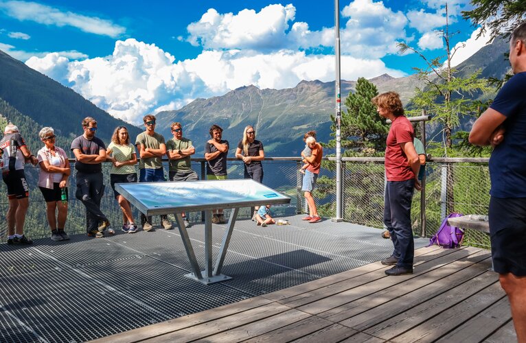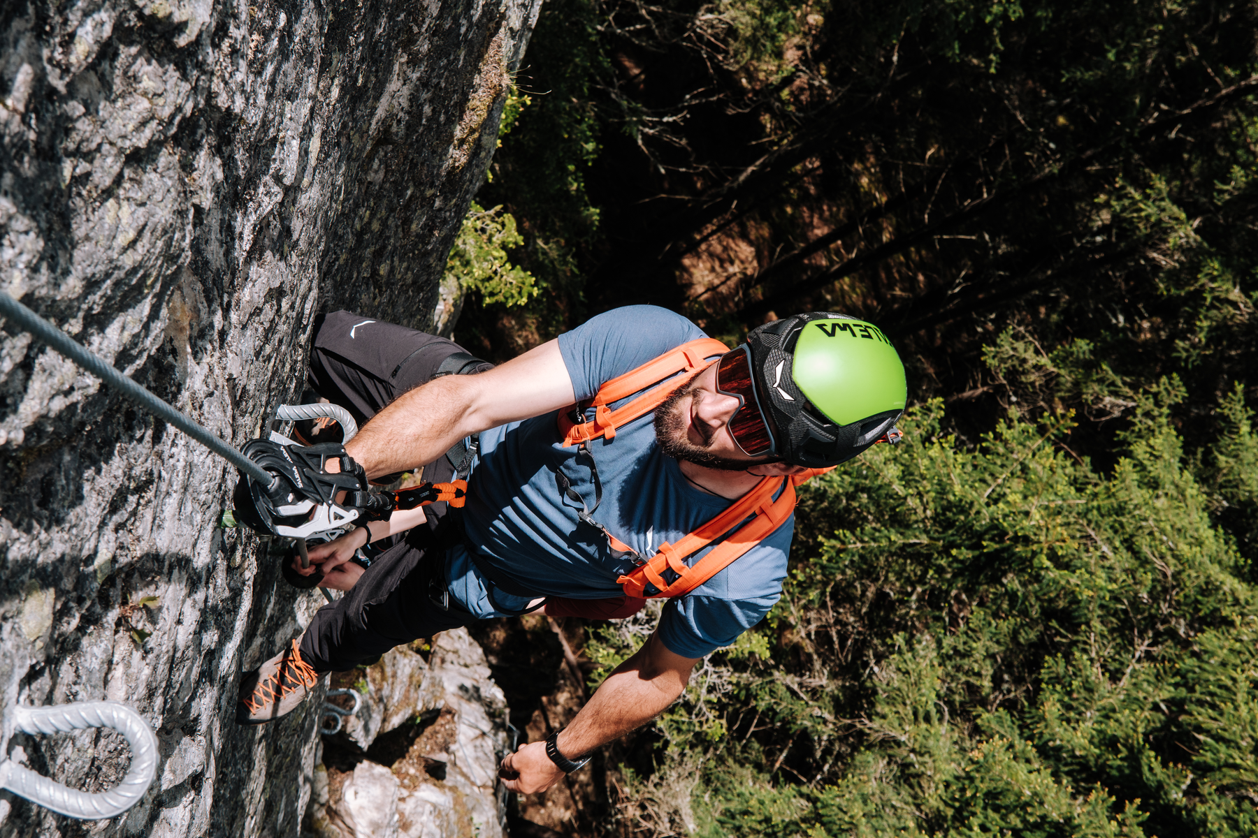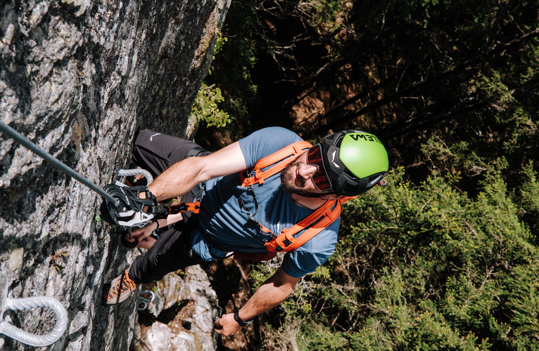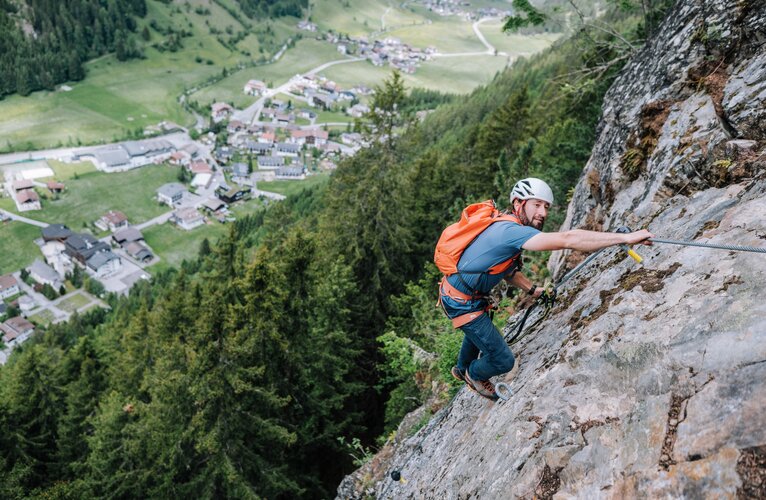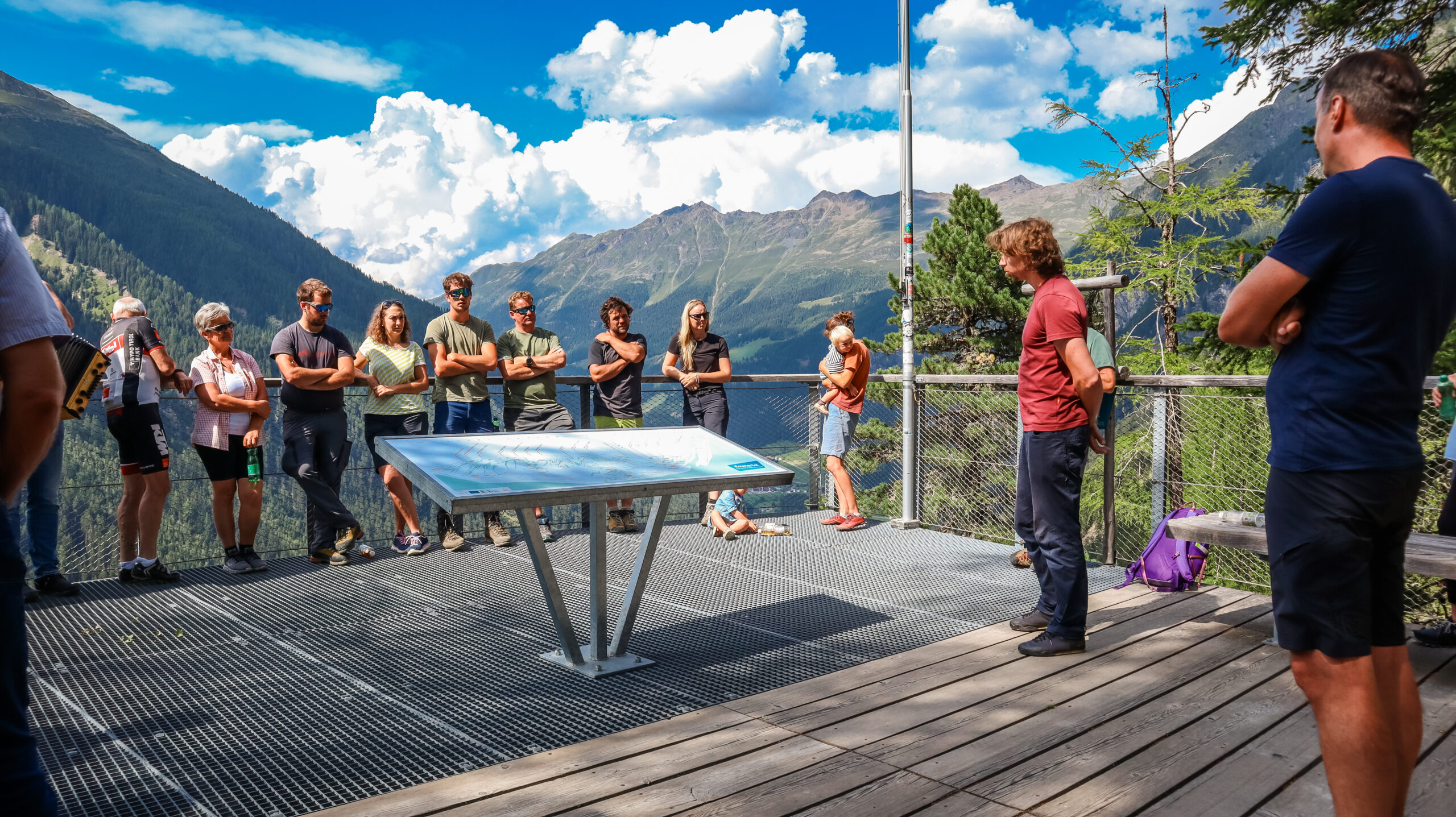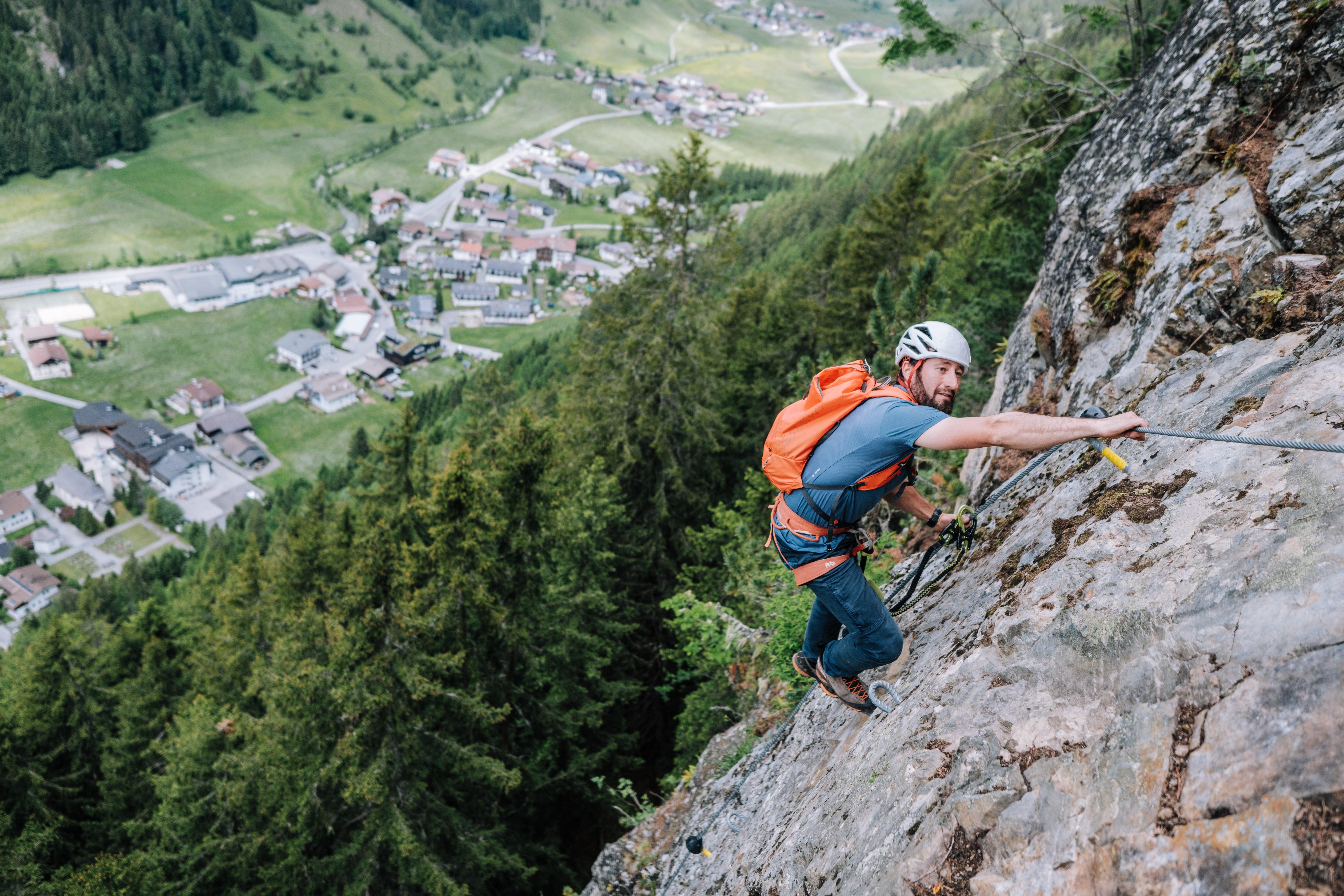 Georg Larcher informierte über die Details des Baus und den Klettersteig selbst: Die Seitwand, eine 100 Meter hohe Felsformation oberhalb von Feichten, bietet eine herausfordernde Route für erfahrene Kletterer. Der Steig führt bis zur spektakulären Aussichtsplattform „Adlerblick“, die majestätisch über der schroffen Gneiswand thront. Da die Felswand auch vom Dorf aus gut sichtbar ist, haben Schaulustige die Möglichkeit, den wagemutigen Kletterer bei ihrem Aufstieg zuzusehen.