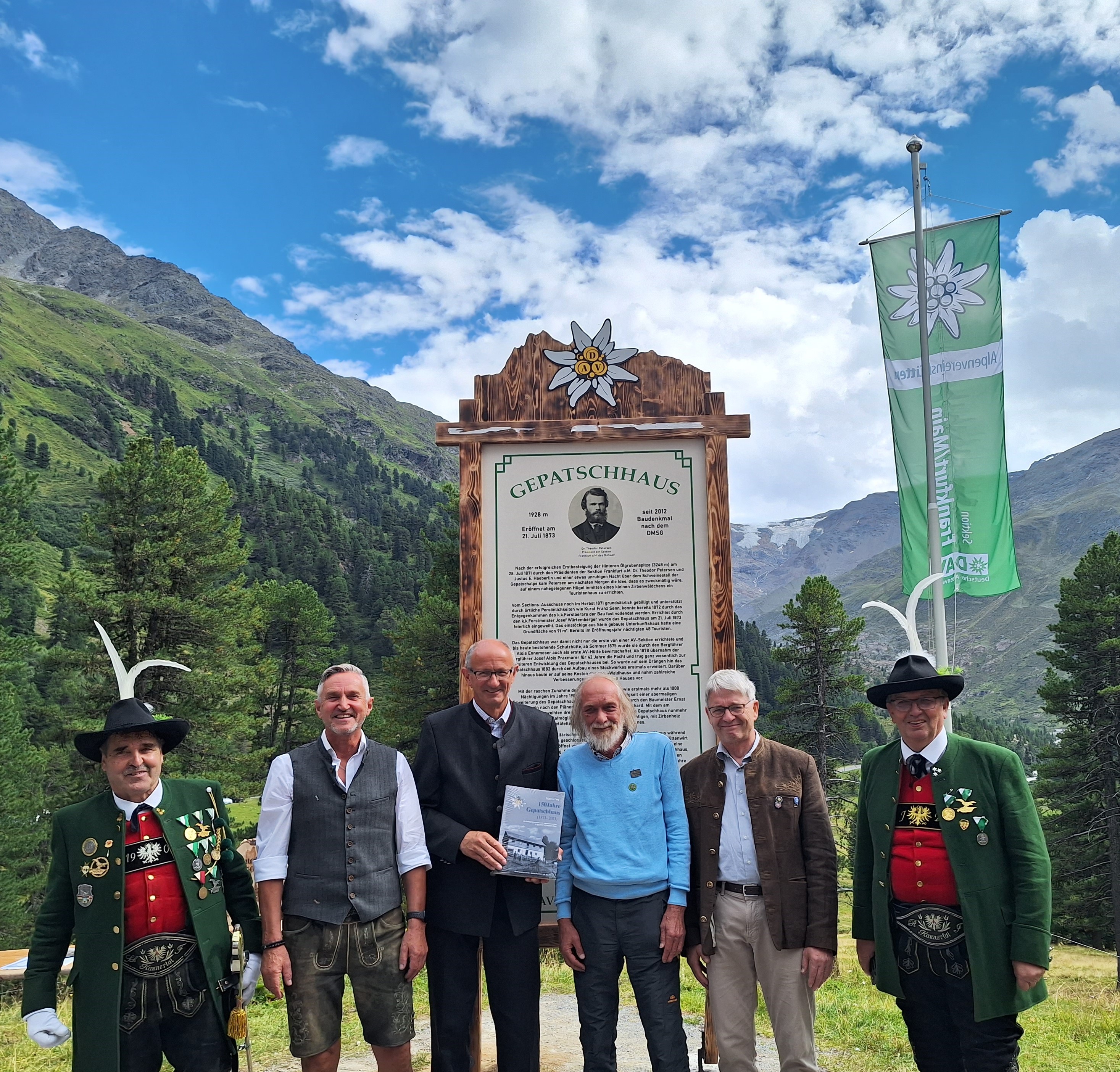 Das Gepatschhaus im hinteren Kaunertal feiert in diesem Jahr als wohl älteste von einer Alpenvereinssektion gebaute und bis heute bestehende Alpenvereinshütte ihr 150jähriges Bestehen. Eröffnet am 21. Juli 1873 stellt sie allein schon durch diese lange Existenz ein wahrhaftiges Zeugnis der Alpingeschichte sowohl mit ihren Glanzzeiten wie auch der weniger erfreulichen Perioden dar. Die Sektion Frankfurt a.M. des Deutschen Alpenvereins nahm diesen einzigartigen Umstand zum Anlass, das Jubiläum mit einer Feier am 12. August 2023 am Gepatschhaus zu würdigen. Nach dem landesüblichen Empfang von Herrn Landeshauptmann Anton Mattle durch die Schützenkompanie Kaunertal und die Mühlbachmusi erfolgten Grußworte der Ehrengäste. Im Anschluss wurde die Festschrift zum 150 jährigen Jubiläum von Martin Frey vorgestellt.