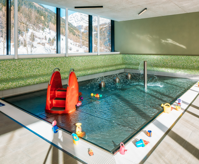 The Quellalpin Kaunertal touches with the power of the nature park and glacier region. In the swimming pool and in the sauna area on the roof of the building with a view of the surrounding mountains, it is easy to immerse yourself in a nature-related wellness experience. Wood, granite, hay and that with the seal of quality excellent spring water characterise the style and ambience of the leisure facility.