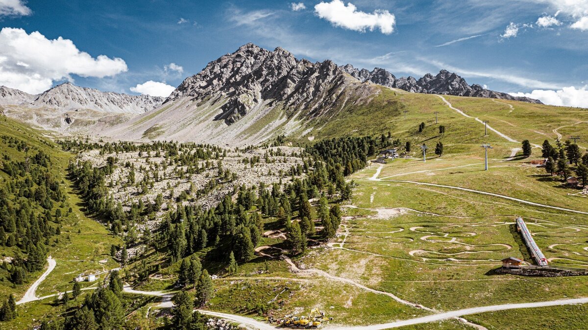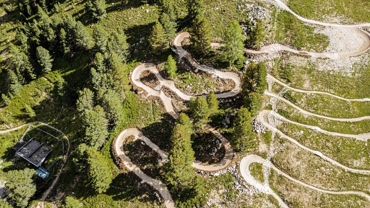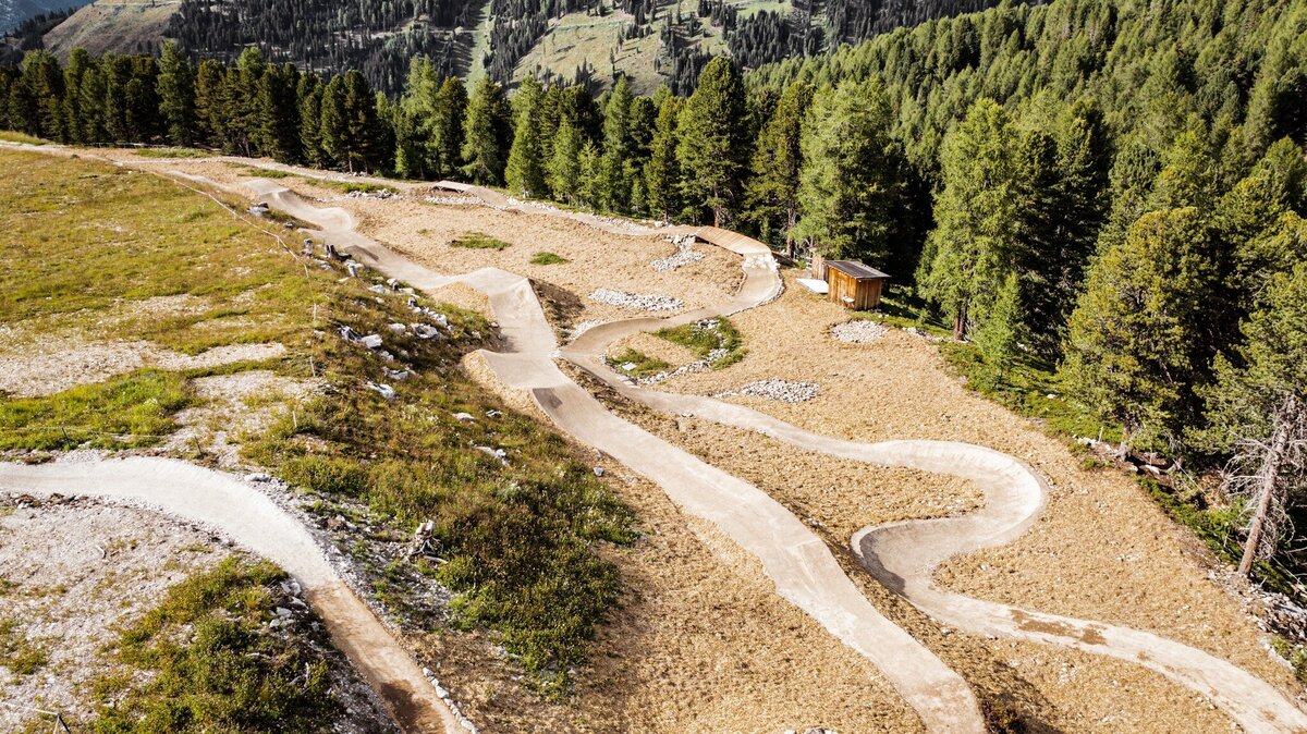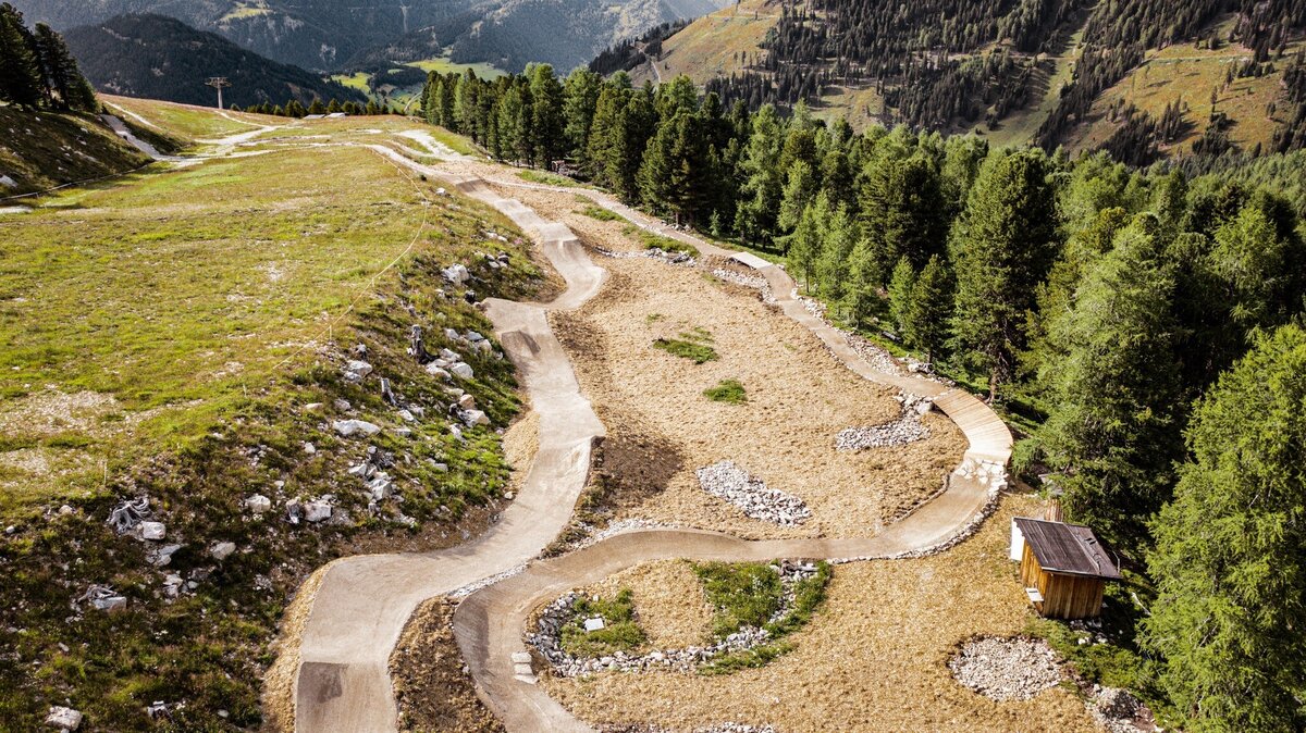 A modern hybrid trail that combines stone, wood, earth and airflow.  Action-packed and playful, the trail leads step-up, step-down to the slopestyle area, which then really helps you take off. The blue main line can always be rolled over, while the red line in slopestyle allows you to collect plenty of air miles. The new Goldsee cable car then catapults you back to the start within 3 minutes. PRE-RIDE - RE-RIDE - FREE-RIDE!