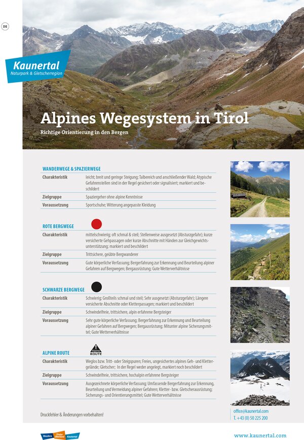 Hikers and mountaineers not only have to study the weather forecast when planning a tour, but also have to consider the effects of climatic shifts. The climate guide is therefore following a promising path: In addition to tour suggestions in all levels of difficulty, it contains interesting facts about the climatic characteristics in the Kaunertal. Facts and information, tips on the most beautiful experiences and specific tips for choosing a route combine to create a "hiking guide with added value". The tour tips book is available together with the hiking map in the Kaunertal information office.