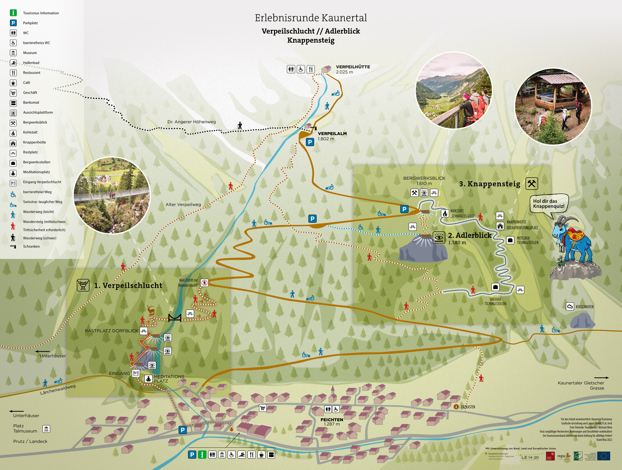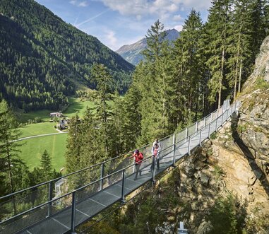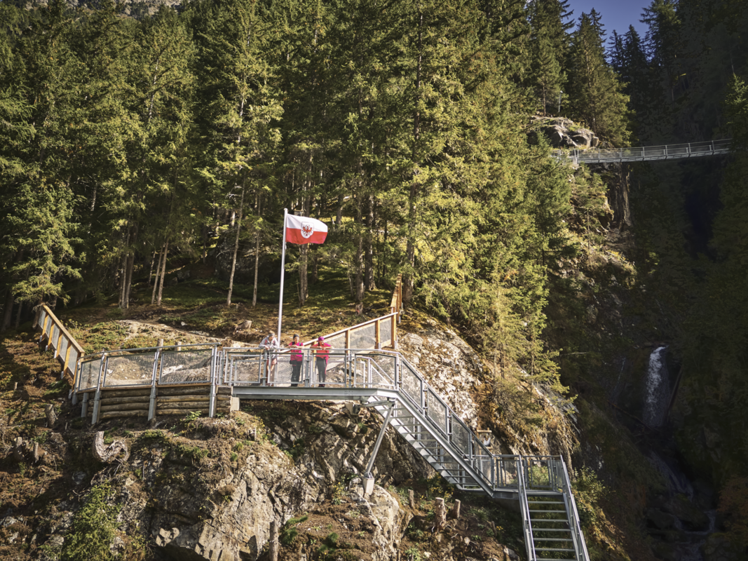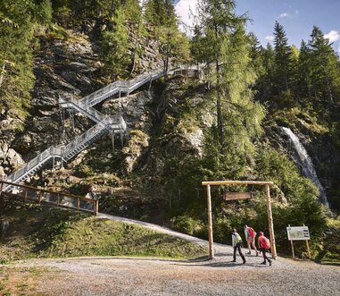 The starting and end point of the circular hike is the Quellalpin in the village center of Feichten. Via the Verpeil Gorge you can reach the Adlerblick and Bergwerksblick viewing platforms. From there the path leads back to the valley floor to Feichten via the Knappensteig.