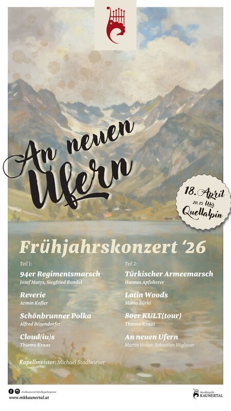 Die Musikkapelle Kaunertal lädt am Samstag, 18. April 2026 zu ihrem traditionellen Frühjahrskonzert ein. Dieser musikalische Abend im Kaunertal Saal (Quellalpin Kaunertal) steht ganz im Zeichen der Blasmusik-Tradition und Gemeinschaft, für die die Kapelle seit Jahrzehnten bekannt ist. Das abwechslungsreiche Programm reicht von klassischen Blasmusik-Stücken bis zu unterhaltsamen Melodien, die sowohl Einheimische als auch Gäste begeistern werden. Die Musikkapelle, die tief im Gemeindeleben verwurzelt ist, präsentiert mit diesem Frühjahrskonzert einen festlichen Auftakt in die neue Konzertsaison und lädt alle Musikfreunde herzlich zum Zuhören ein.