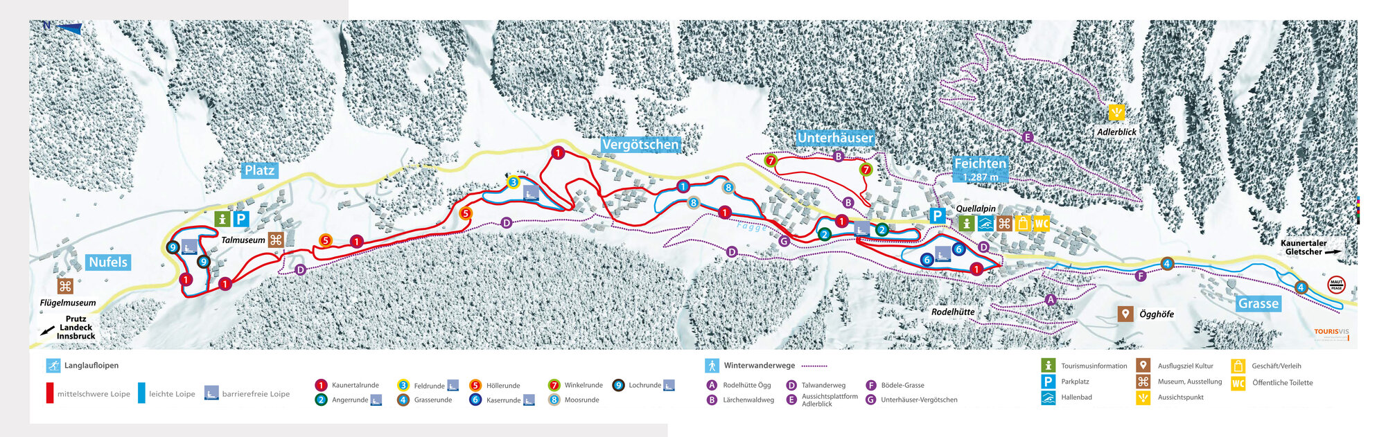 You have no plan...yet? How about this: Get to know the nine trails in the Kaunertal plus the cross-country skiing region Gachenblick while you are scrolling through the trail map. Shown are the route length, the detailed course and a map for illustration.