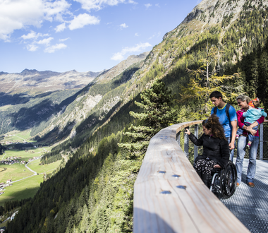 Want to see the grand sweep of the Kaunertal at the beginning of your holiday? There's nowhere better to do this than from the Adlerblick viewing platform! Take a deep breath and let the surrounding three thousand meter peaks, the wild nature, and countless magical places take your breath away. On a more than 100 m high rock wall above Feichten, you can enjoy views that will take your breath away.