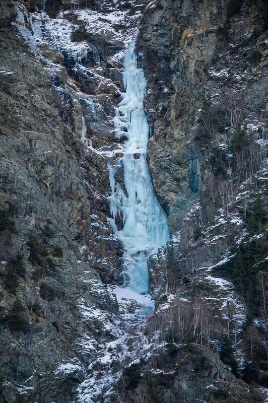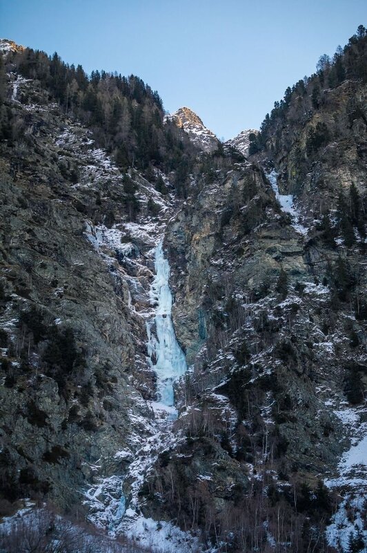 Ascent: Cross the field and follow the river bed to below the waterfall. One pitch WI 2, follow the chute ca. 30 minutes to the entrance.